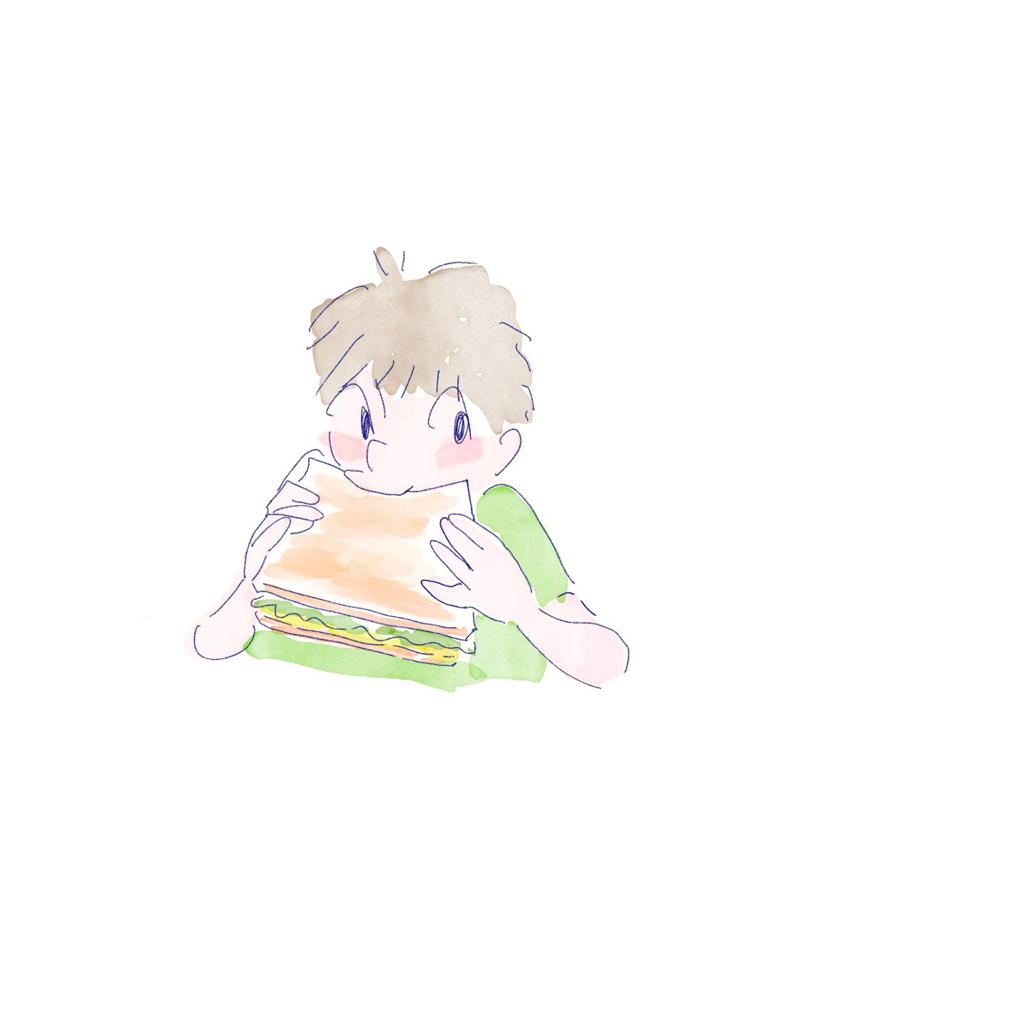 A soft watercolor illustration of a character enjoying a giant sandwich. This piece captures a light, cozy moment from everyday life with a touch of humor and warmth. Hand-drawn and colored to preserve the playful feeling of the scene.